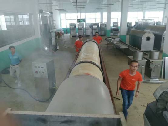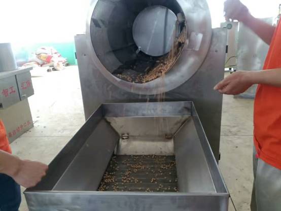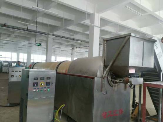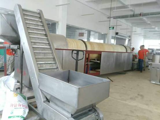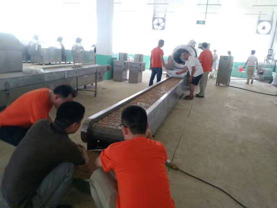 陜西客戶來許昌智工測(cè)試6米長(zhǎng)智能電磁炒貨機(jī)流水線炒豌豆