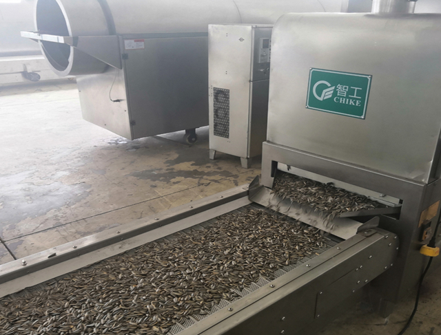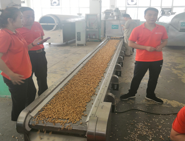 湖南、安徽兩地客戶來許昌智工現(xiàn)場考察電磁炒貨生產(chǎn)線設備炒制花生果、葵花籽!