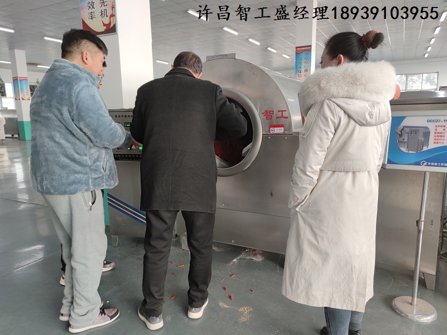 12月25日,平頂山客戶來廠試用9-16型電磁炒貨機,炒制辣椒。一鍋炒60斤,20分鐘炒制一鍋,顏色漂亮,香味純正,效果滿意