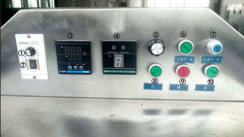 五、調(diào)節(jié)炒鍋轉(zhuǎn)速:調(diào)節(jié)圖片上“①調(diào)速器旋鈕(正面白色)”,順時針調(diào)節(jié)加速,逆時針調(diào)節(jié)減速。(注:可根據(jù)炒制品特性,適當(dāng)調(diào)整。)